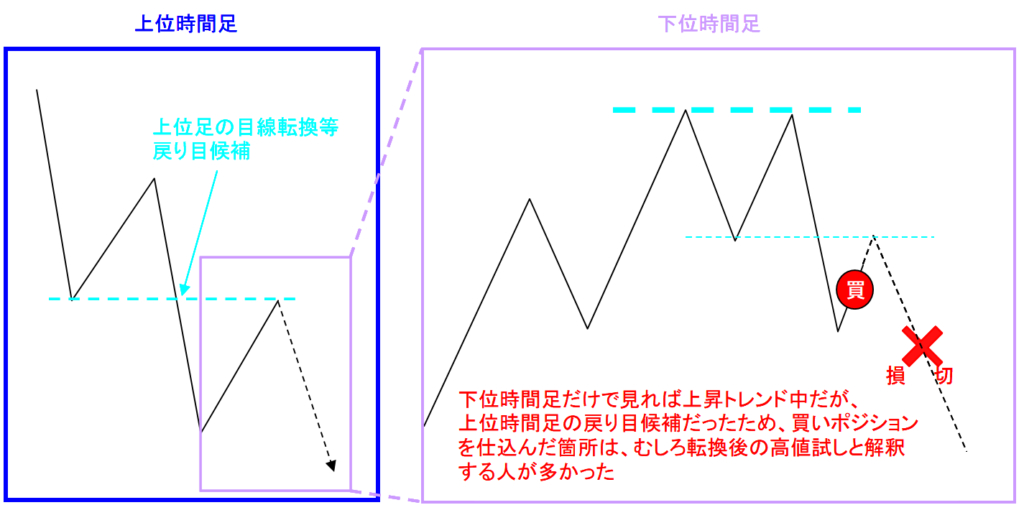 この場合、下位時間足だけを見ていたら、ここからの上昇は、上昇トレンド中の推進波と解釈できますが、そこが上位下落トレンドの強い戻り目候補だとしたら、「転換濃厚な箇所での高値試し(最後の上昇)」と解釈する人が多くなり、むしろここでの買いポジションは、その後の転換下落のスタートダッシュの燃料になってしまいます。