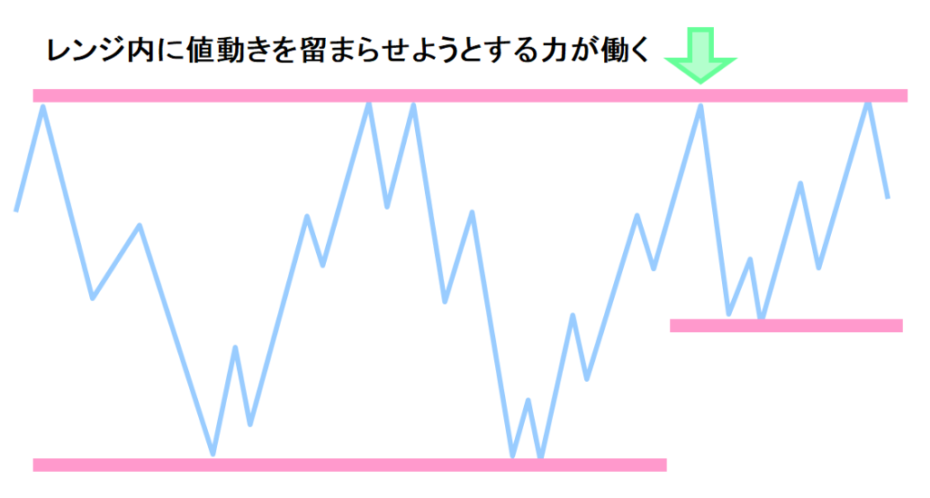 レンジ相場の上端・下端では、レンジ内に値動きを留まらせるような力が働きやすい