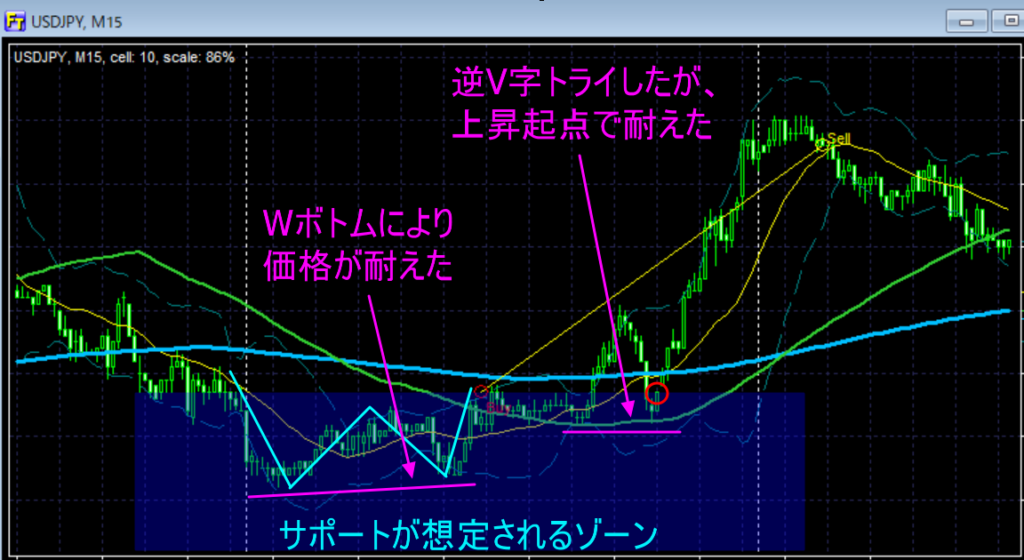 このラインは、レジスタンス側からしたら、正に最後の砦なので、自分でもここからの転換上昇を狙うのであれば「多くの仲間も一緒に守ってくれる」ため、簡単には破られませんし、逆に言えばここを抜かれたら「敗北」を決定付けることになりますので、ストップロスを置くのに適した位置となります。