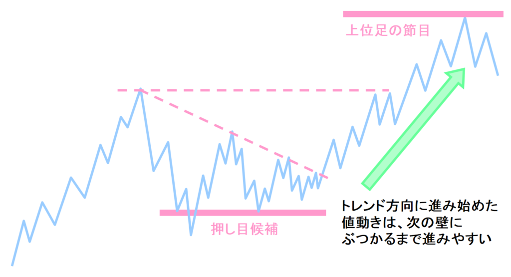 そして、どちらかに進み始めた値動きは、次の壁にぶつかるまで、その流れを継続しやすいです。