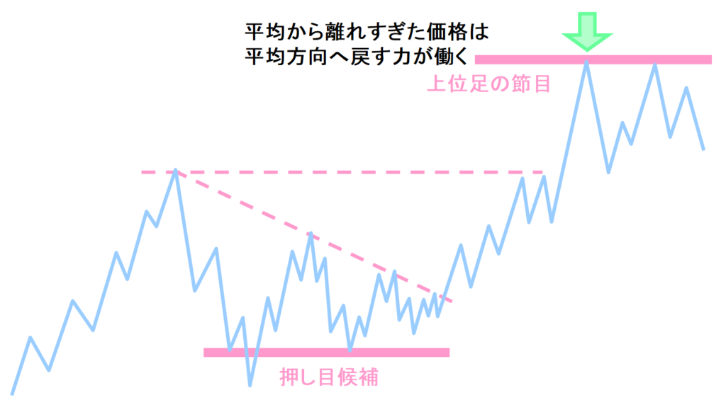 平均から離れすぎた価格は、何かのきっかけで乖離を修正しようと、平均の方向へ強く戻す力が働く。