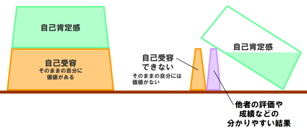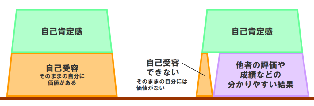 自己受容出来ていなくても、「他者の評価」や「成績など分かりやすい結果」が得られているうちは、それらが土台となるため、自己肯定感を積み上げることができ、「自分に価値がある」と思うことができます。(上図右側)