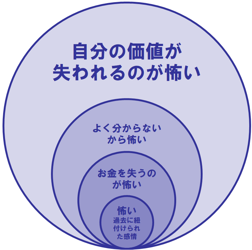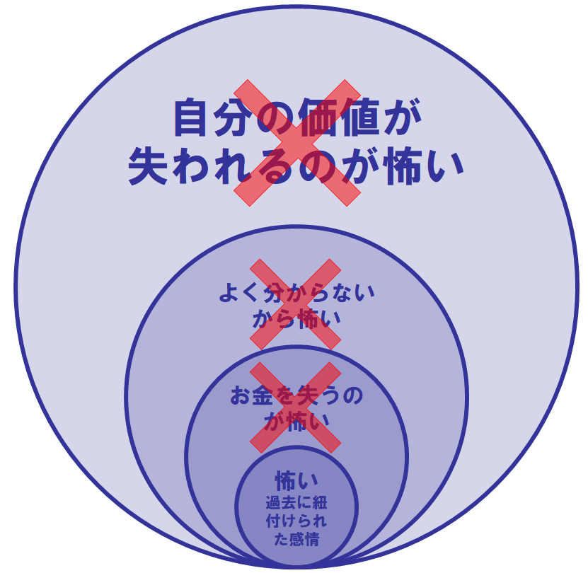 自己受容ができない人は、「失敗=自分の価値が失われる」と感じてしまうため、恐怖心が生じます。(下図の一番大きな円のイメージ)
